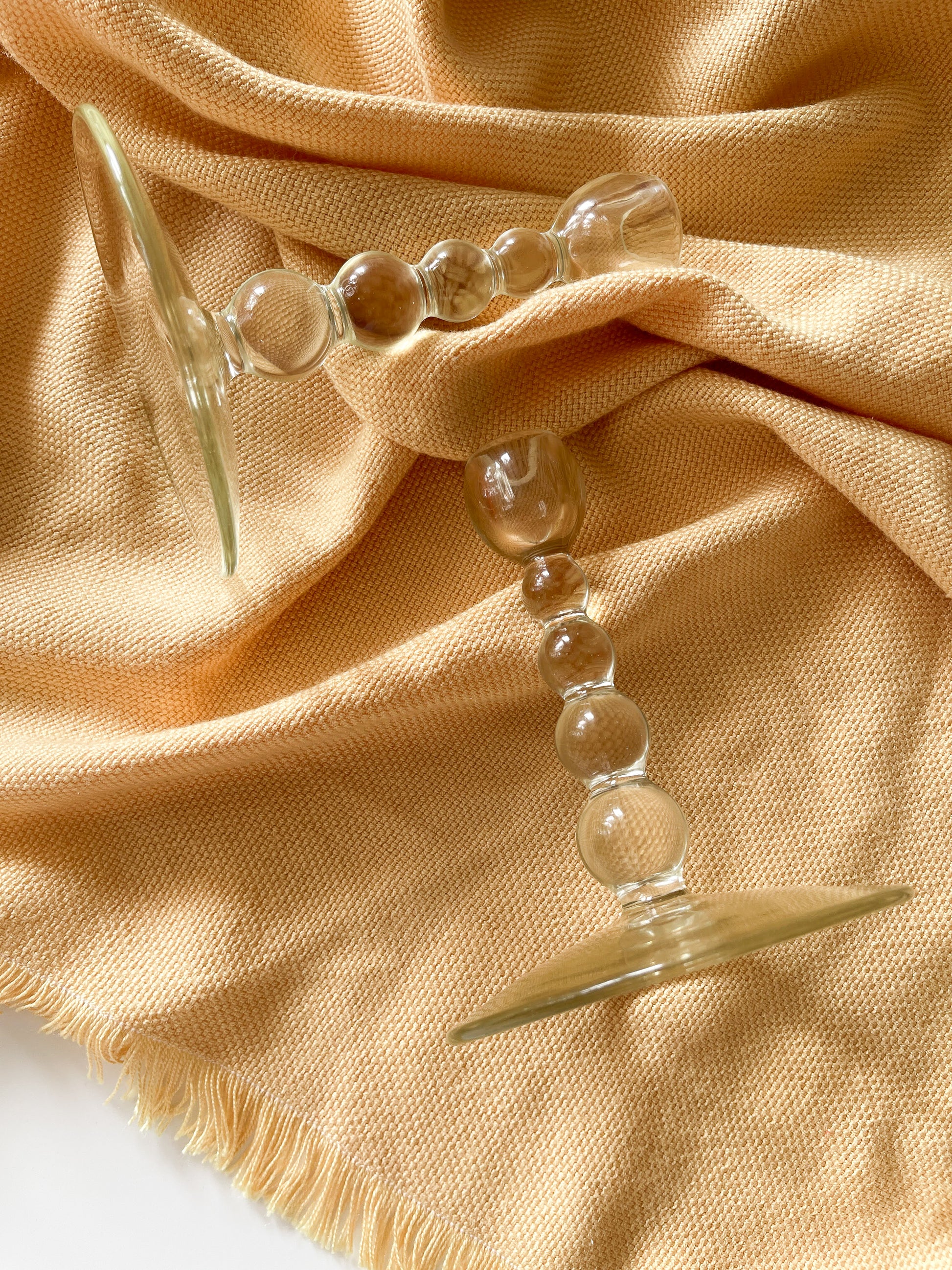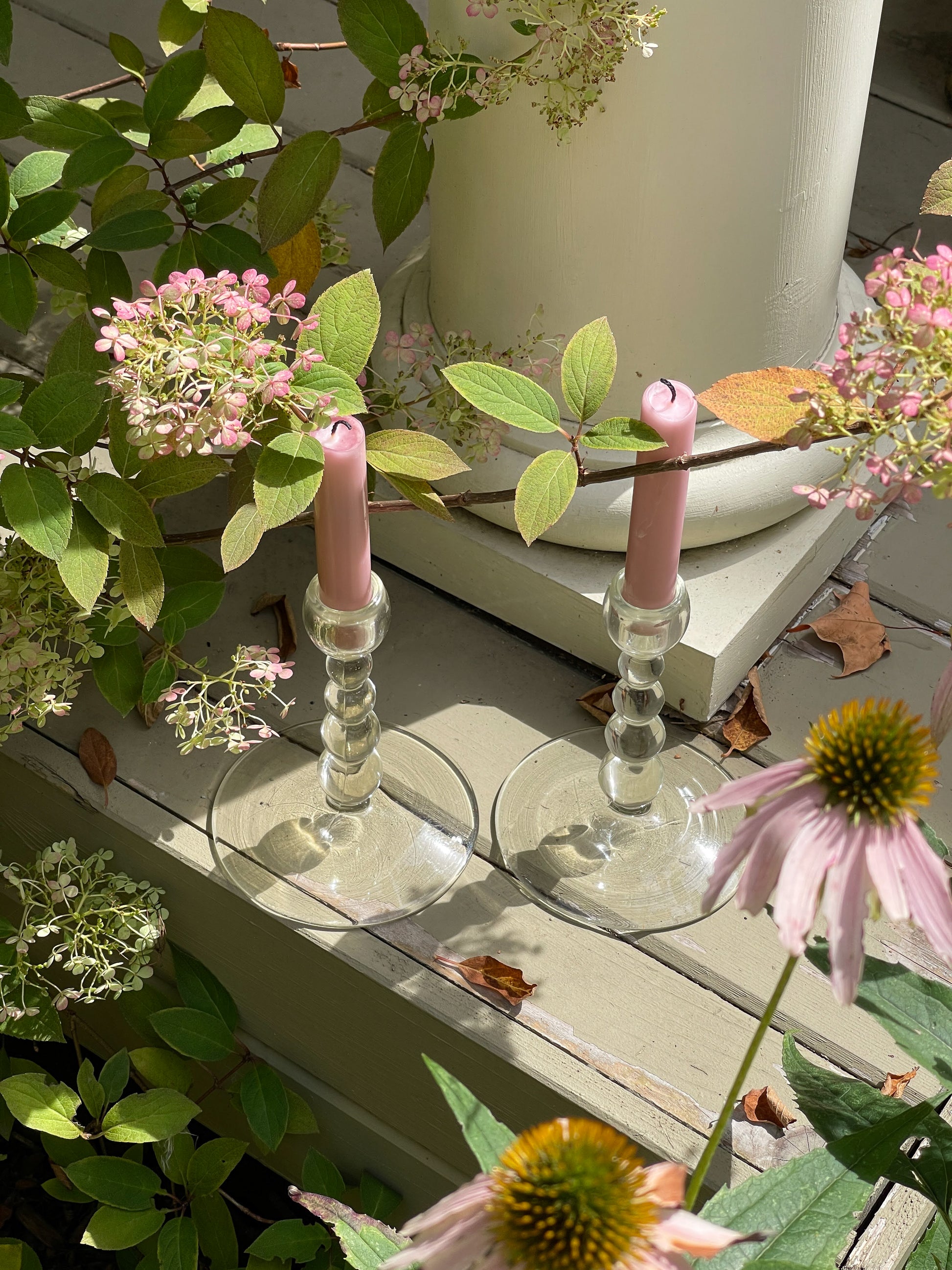 A sleek and timeless pair of hand-pressed clear glass ball stem candlesticks, circa 1940s.