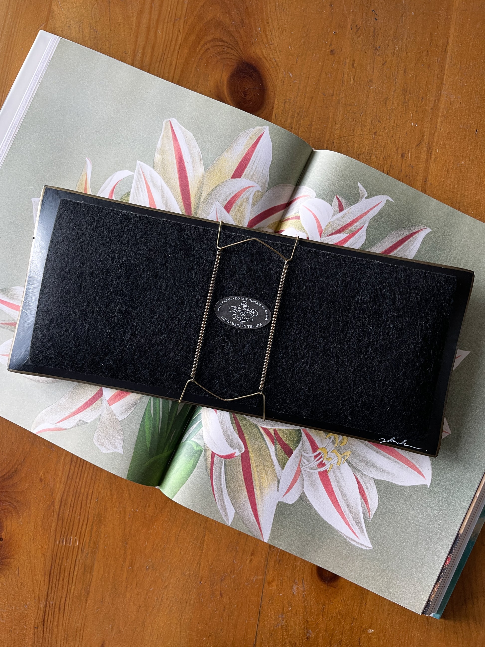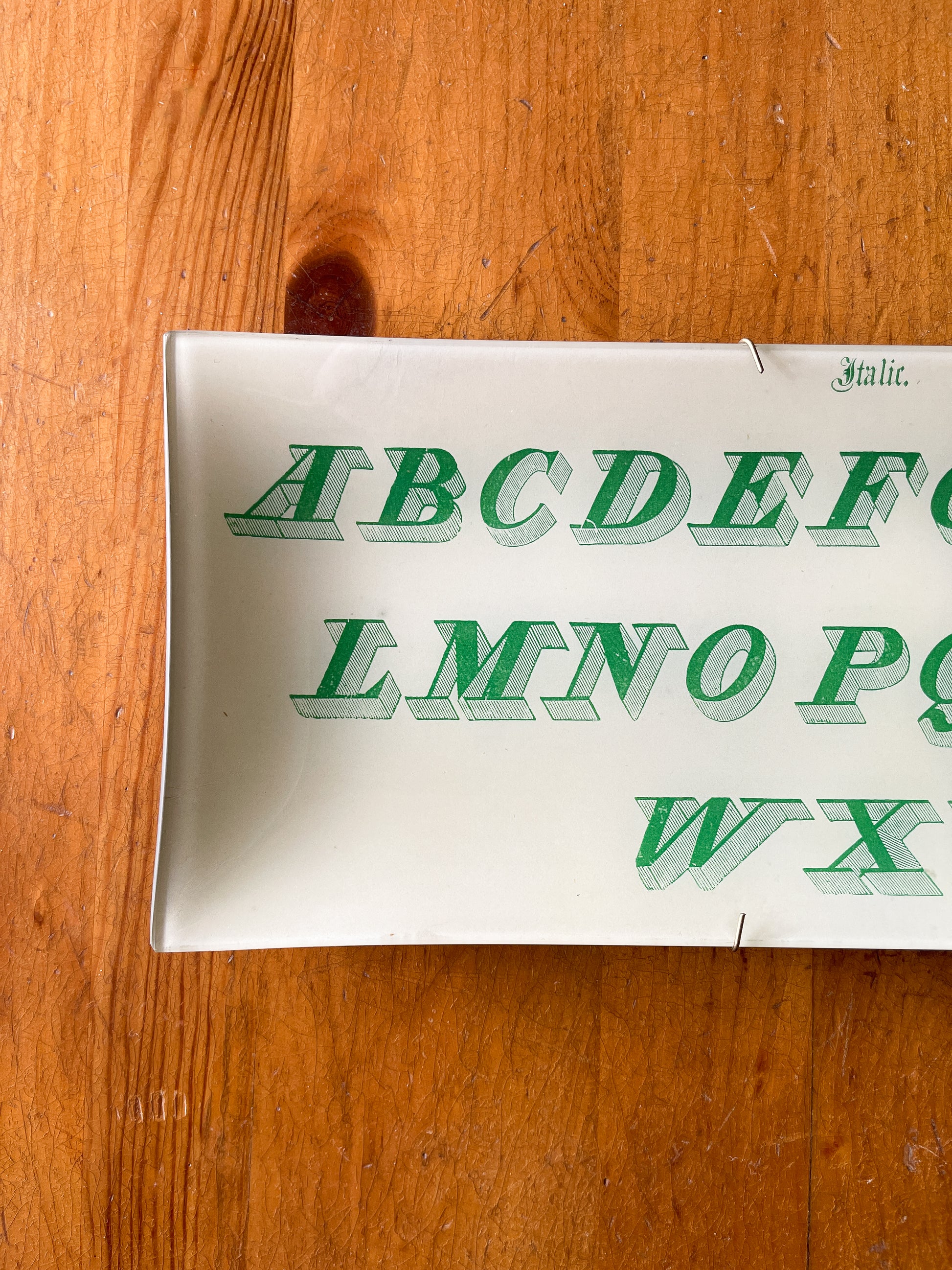 This extra long rectangular tray is one of the rarer sizes produced by the studio. It features a shaded, three-dimensional Italic typeface in green.