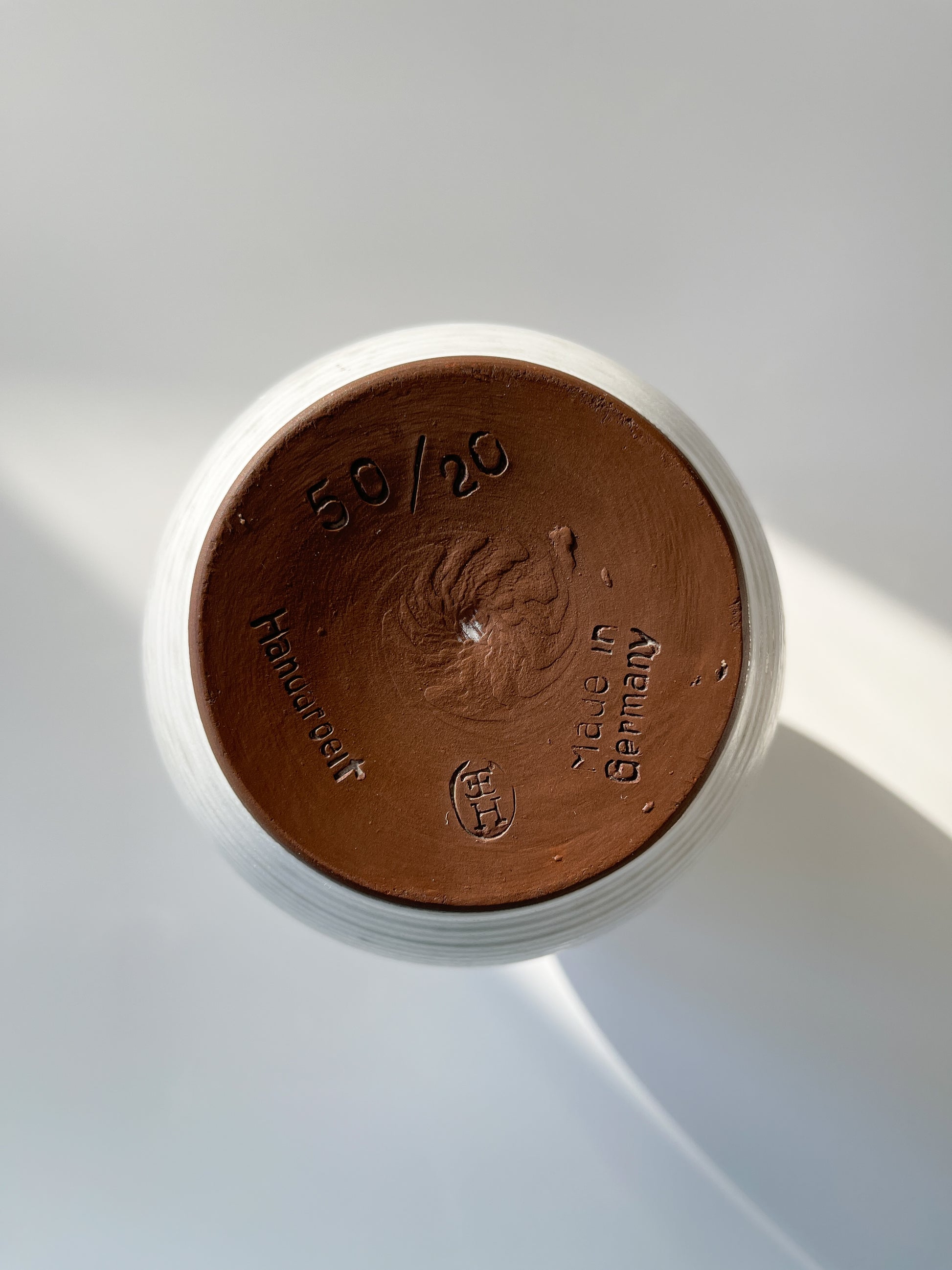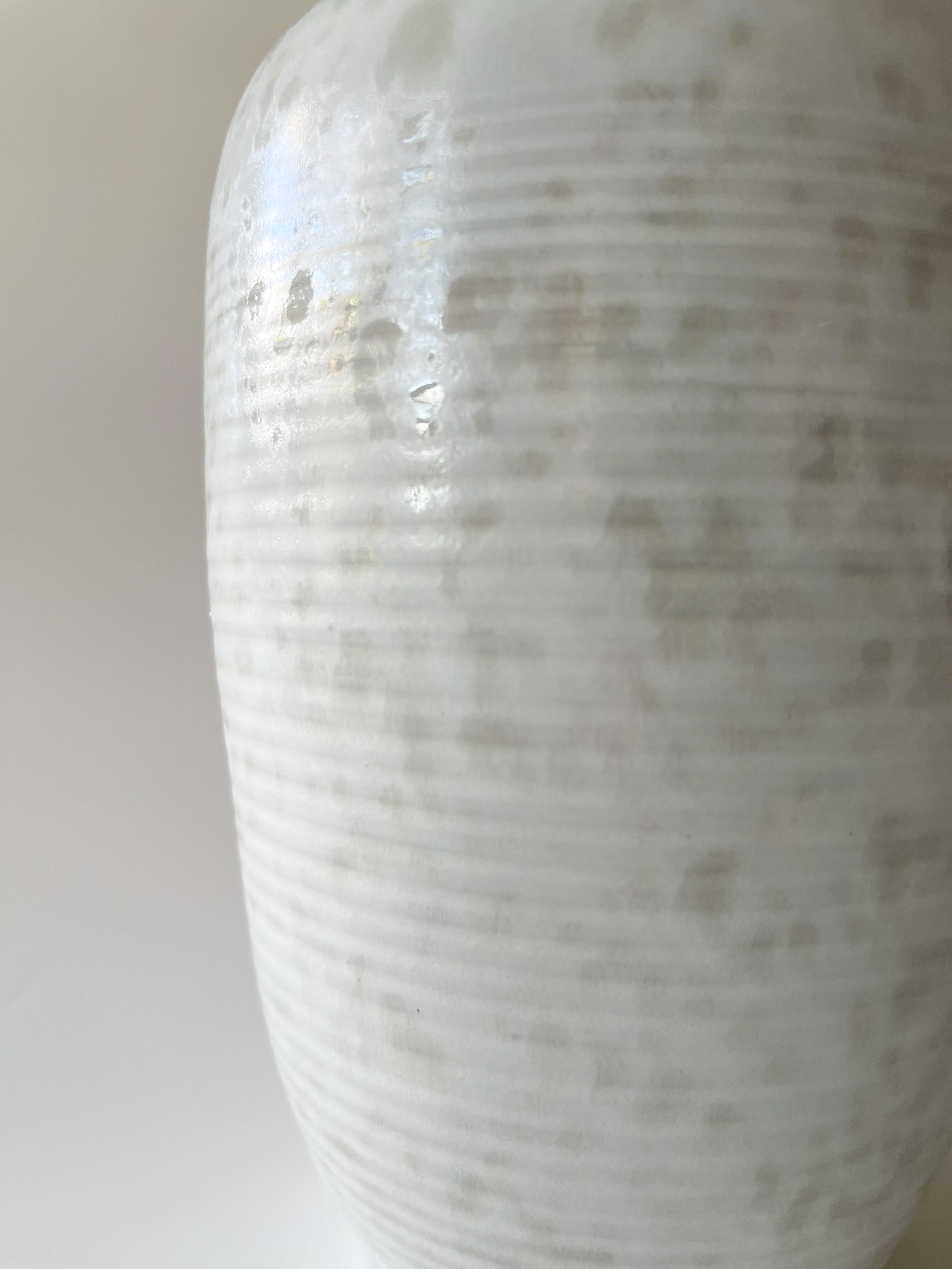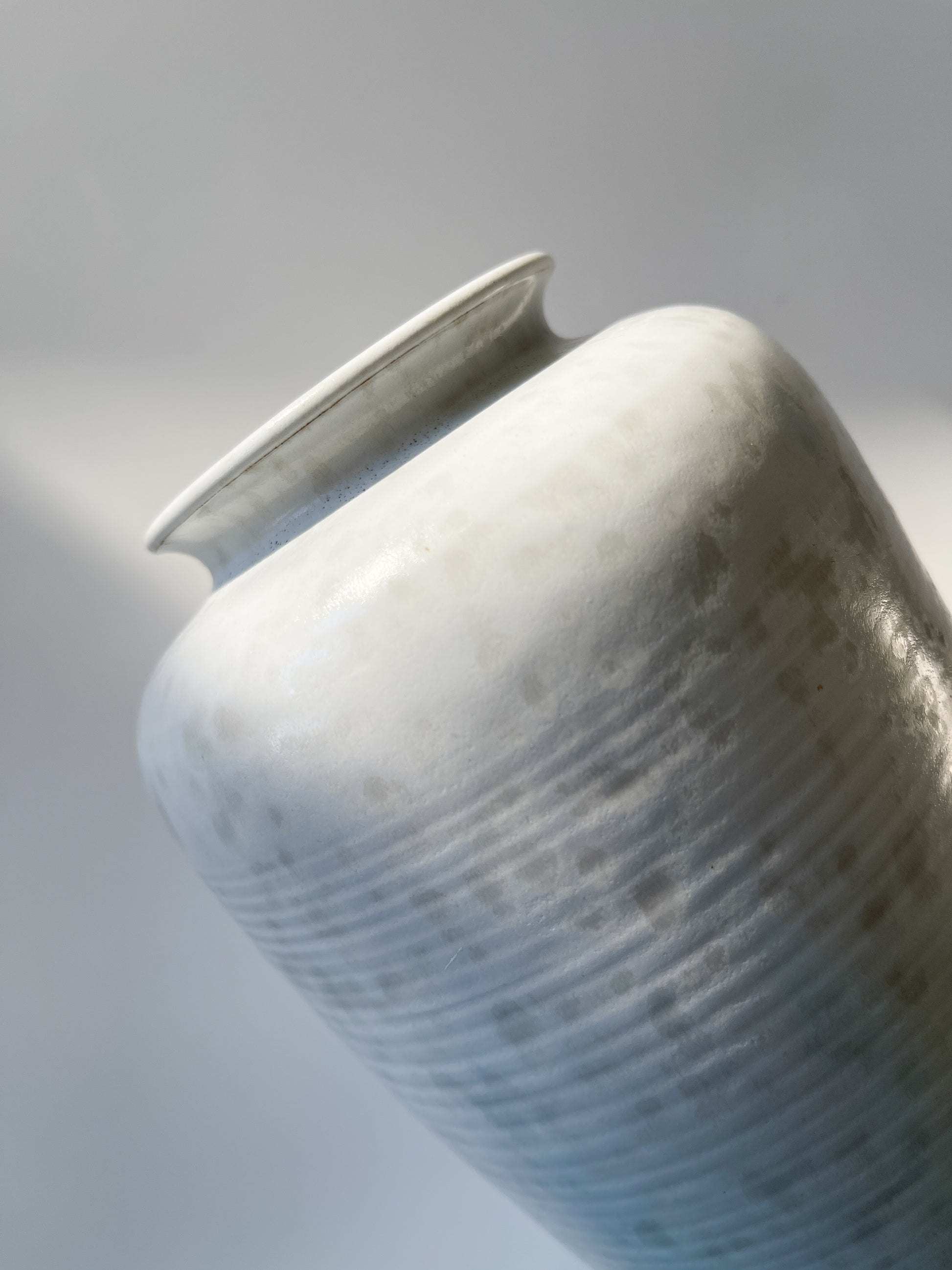 This handcrafted vase features a minimal, finely ribbed form and a soft white satin glaze, flecked with glossy, light-catching patches. It reflects the restrained, Scandinavian-inspired designs of midcentury German ceramics.