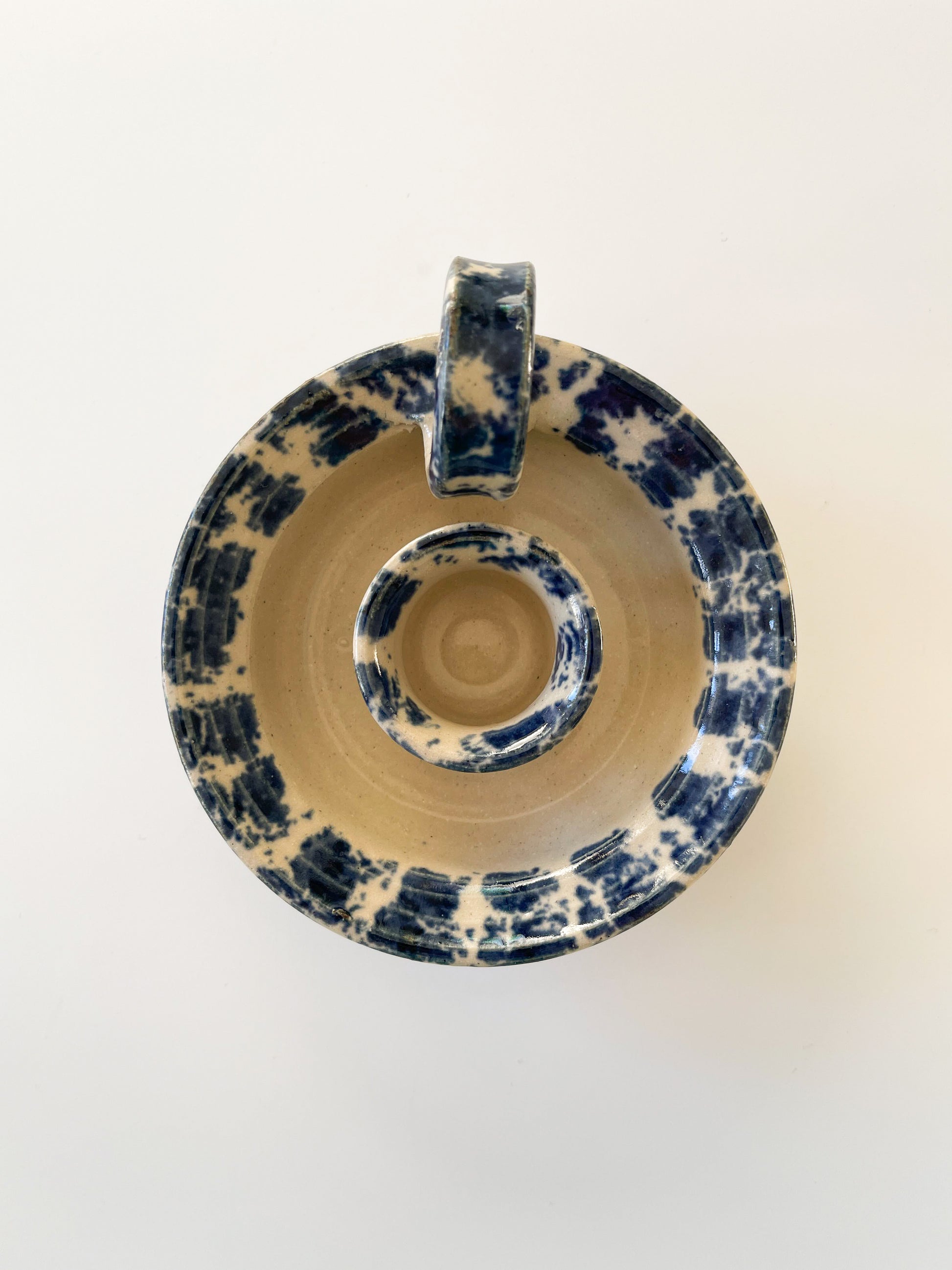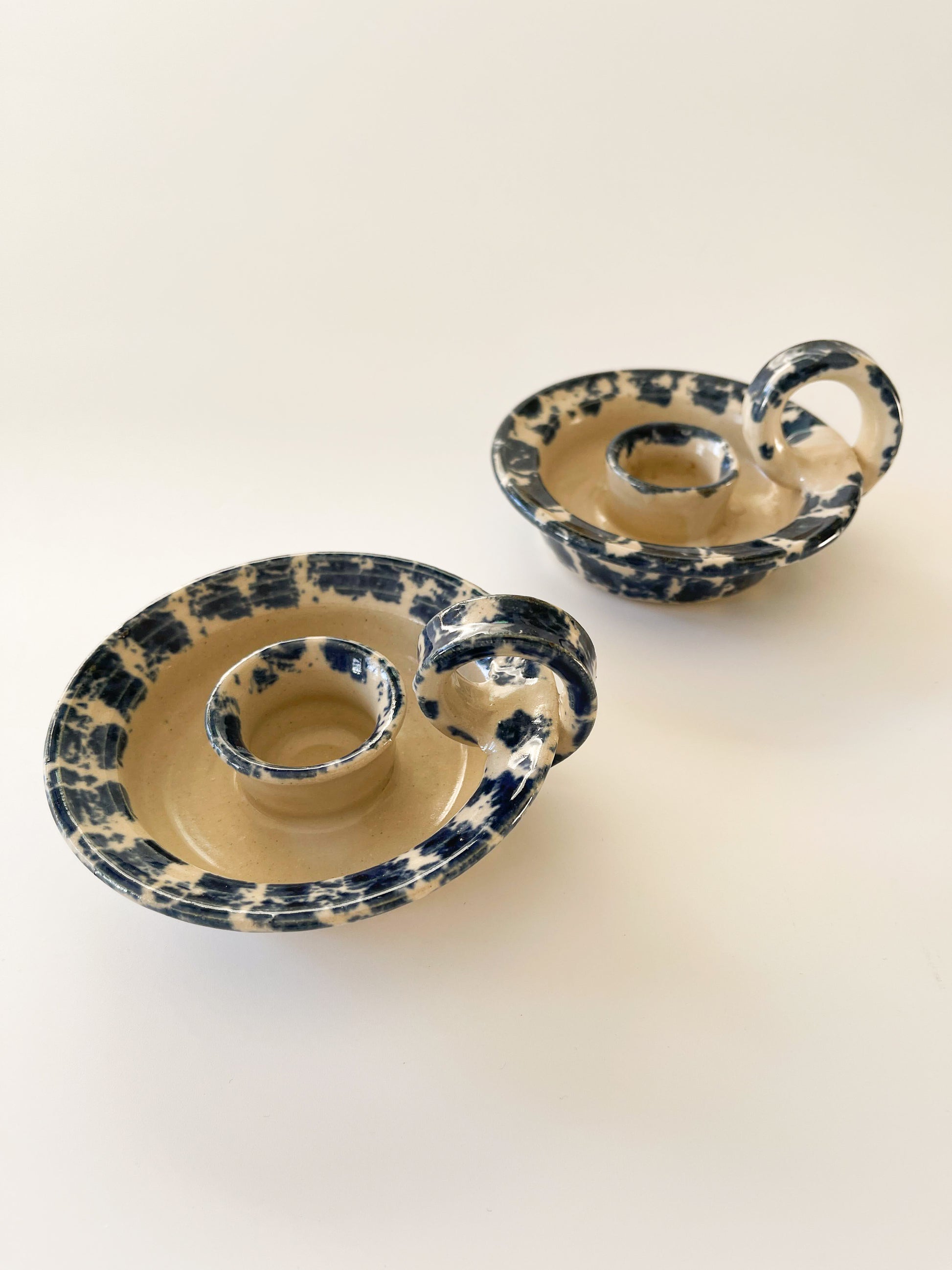 Pair of vintage handmade studio pottery chamberstick candle holders with blue sponged decoration.