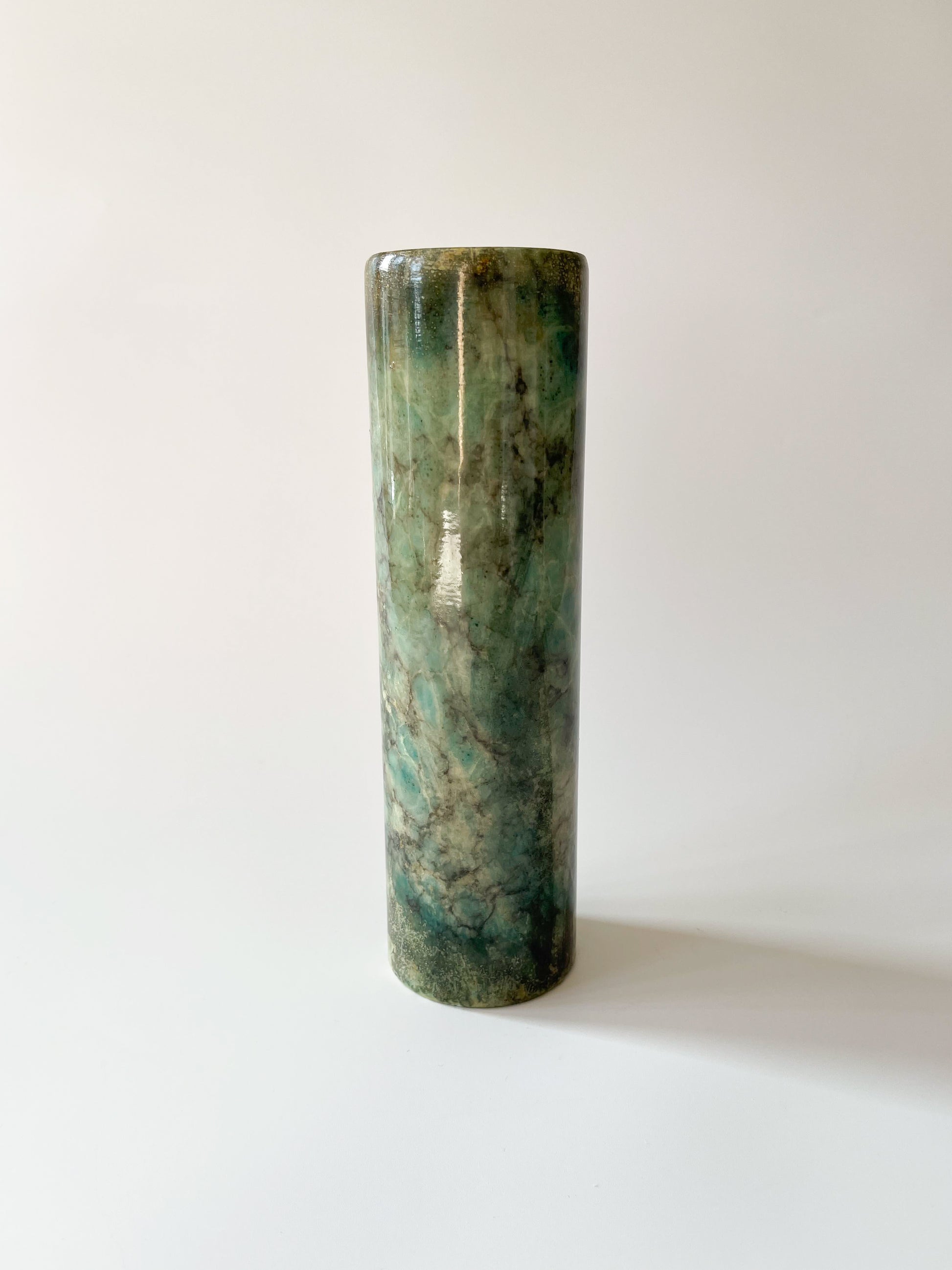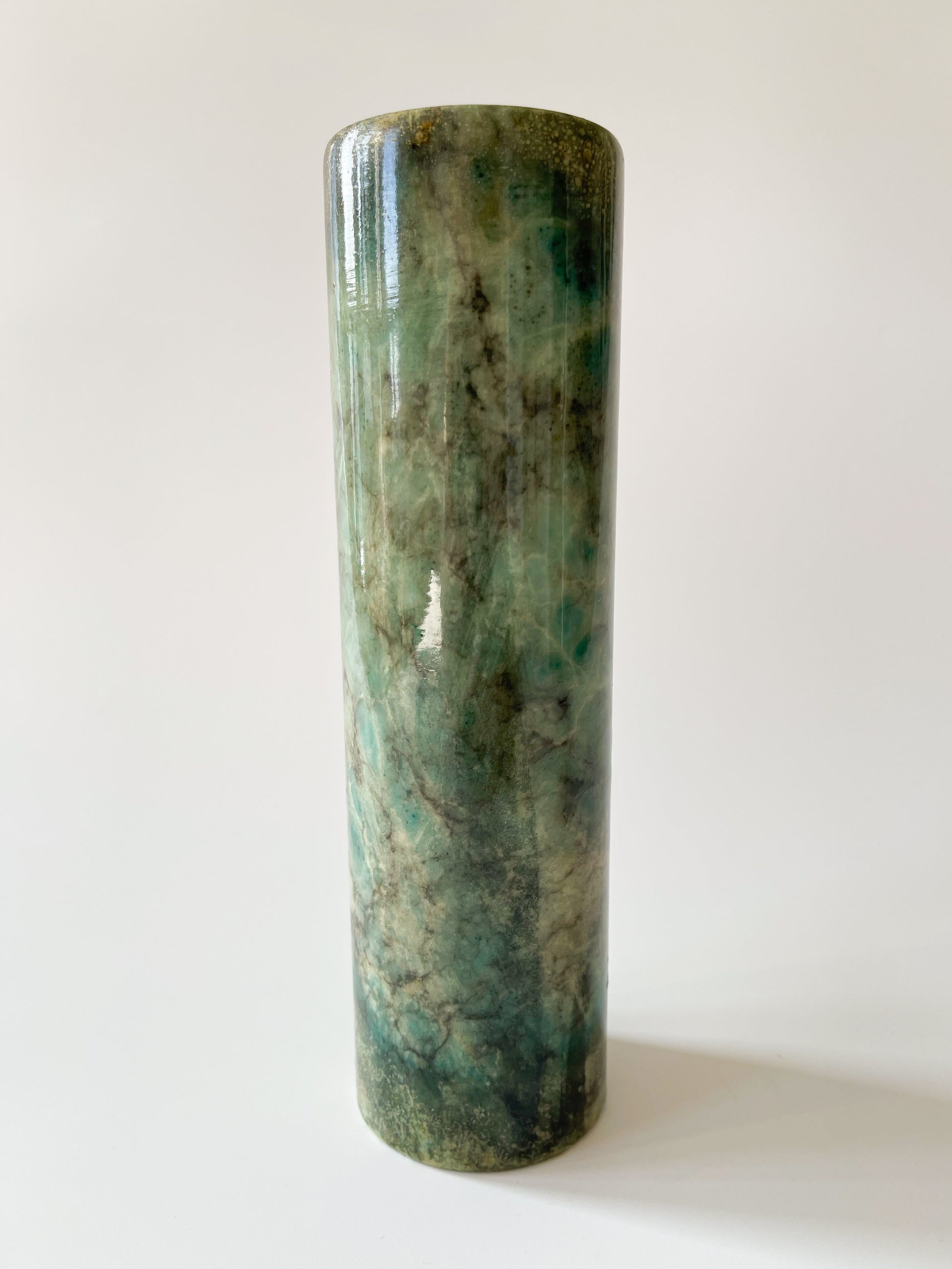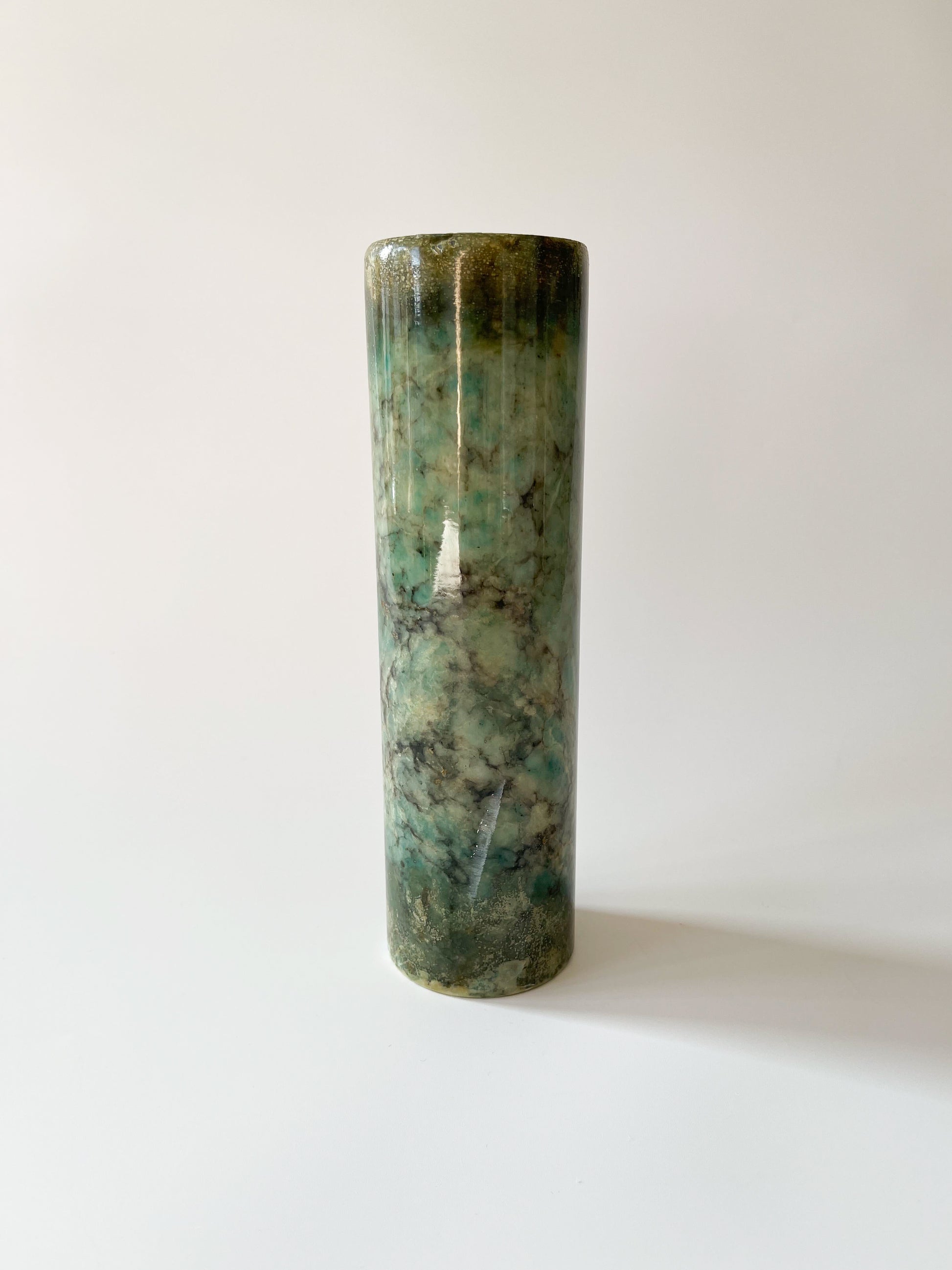 A cylindrical vintage green alabaster bud vase, circa mid-20th century.
