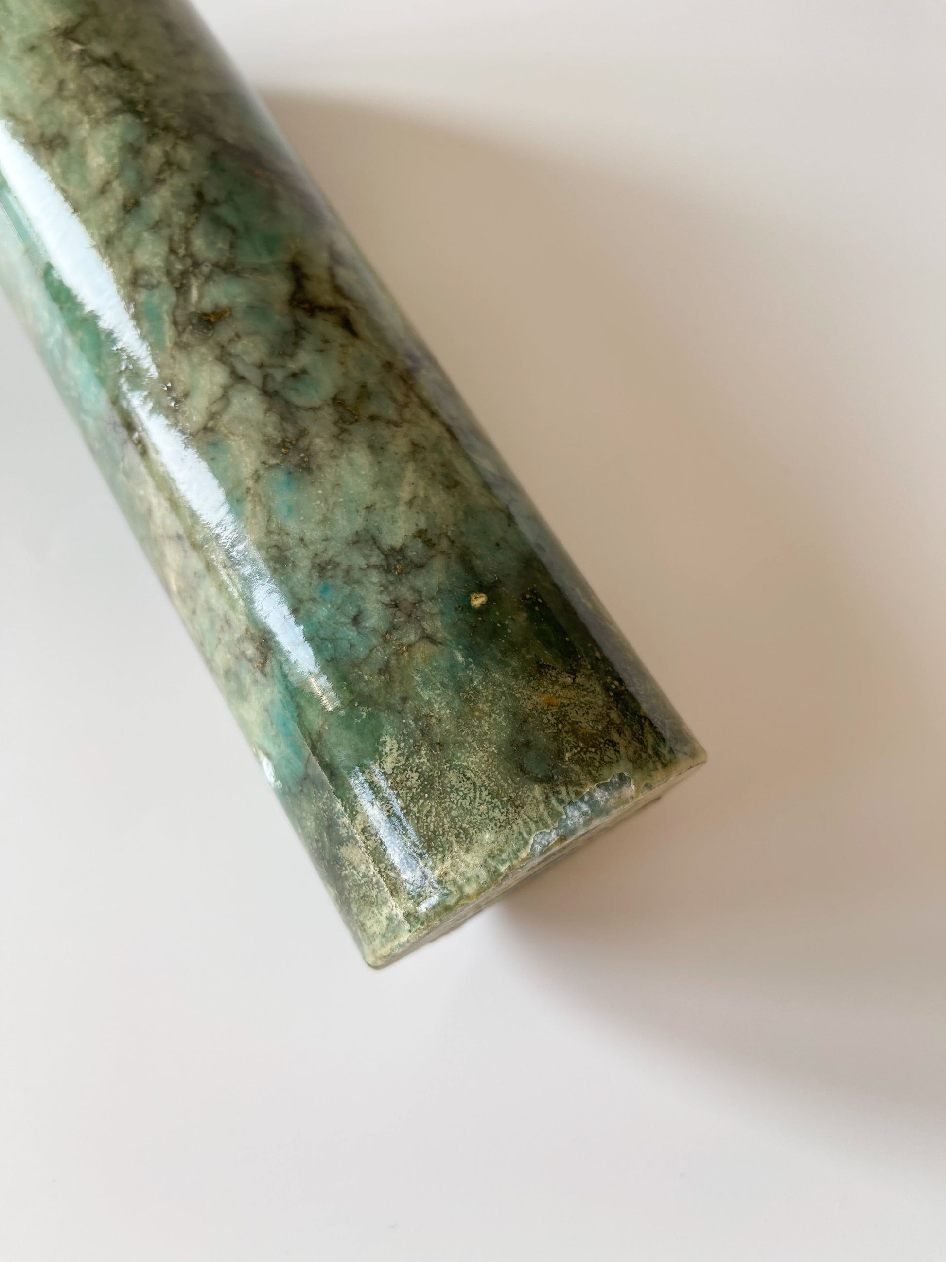 Condition: Age consistent wear. There is a long scuff to one side of the vase near the base, and a scratch opposite. Some wear to the original finish, including areas of lifting, flaking, and yellowing. Such finishes were traditionally applied to enhance colour, create a wet stone effect, and reduce porosity. Over time, these lacquer or resin coatings commonly become brittle, particularly around rims where handling and moisture are most common. This wear does not affect the integrity of the stone.